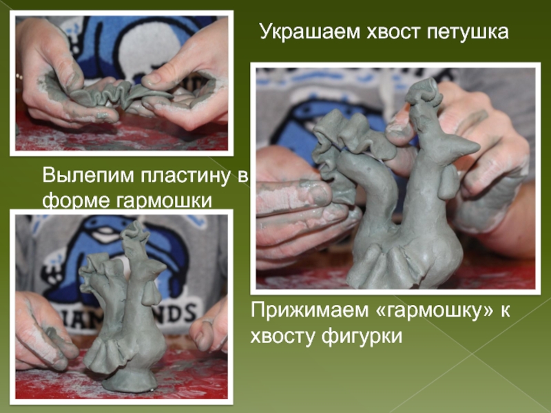 Украшаем хвост петушка Вылепим пластину в форме гармошки Прижимаем «гармошку» к хвосту фигурки