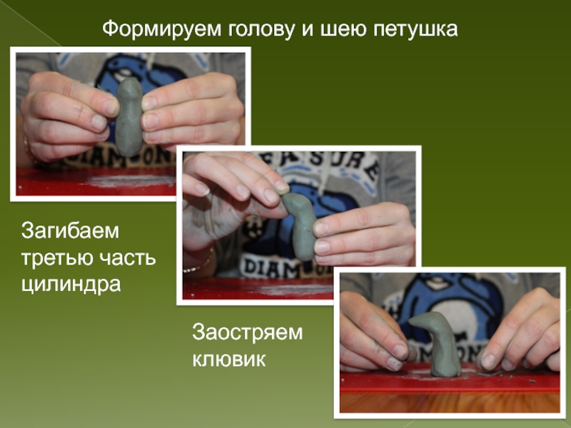 Формируем голову и шею петушкаЗагибаем третью часть цилиндраЗаостряем клювик