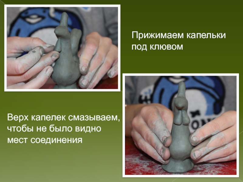 Прижимаем капельки под клювомВерх капелек смазываем, чтобы не было видно мест соединения