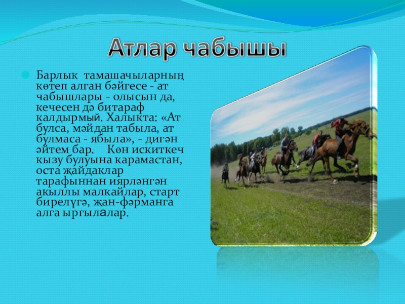 Слайд 8Барлык тамашачыларның көтеп алган бәйгесе - ат чабышлары - олысын да,