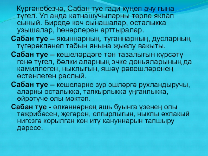 Сабан туе – кешеләрне зур эшләргә рухландыручы, аларны осталыкка, тапкырлыкка уңганлыкка, өйрәтүче олы мәктәп.