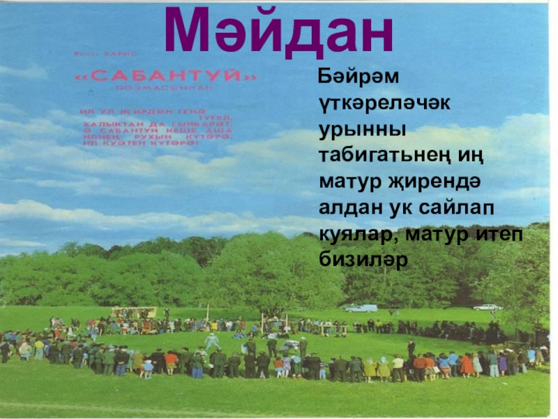 Мәйдан   Бәйрәм үткәреләчәк урынны табигатьнең иң матур җирендә алдан ук сайлап куялар, матур итеп бизиләр