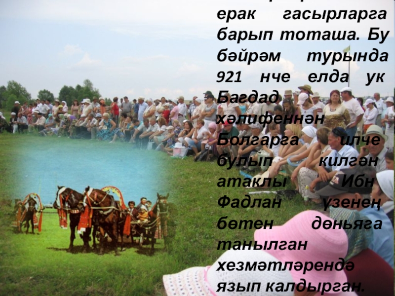 Слайд 4 Сабантуй тамырлары белән ерак гасырларга барып тоташа. Бу бәйрәм турында 921