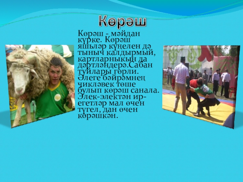 Слайд 7 Көрәш - мәйдан күрке. Көрәш яшьләр күңелен дә тыныч