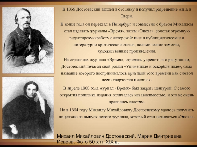 Слайд 8Михаил Михайлович Достоевский. Мария Дмитриевна Исаева. Фото 50-х гг. XIX в.