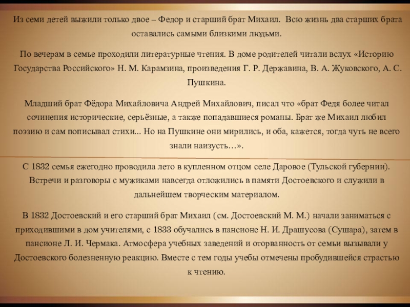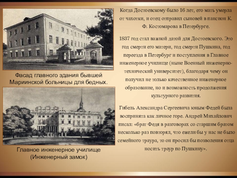 Когда Достоевскому было 16 лет, его мать умерла от чахотки, и отец отправил сыновей в пансион К. Ф. Костомарова в Петербурге.