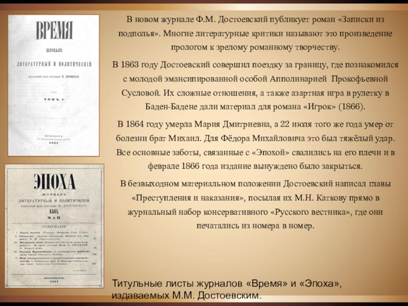 Слайд 9Титульные листы журналов «Время» и «Эпоха», издаваемых М.М. Достоевским.