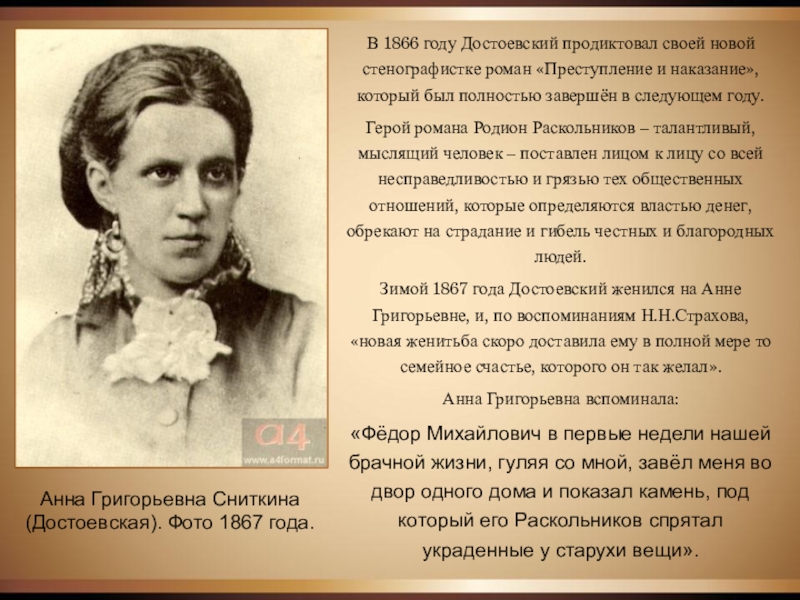 «Фёдор Михайлович в первые недели нашей брачной жизни, гуляя со мной, завёл меня во двор одного дома и показал камень, под который его Раскольников спрятал украденные у старухи вещи».