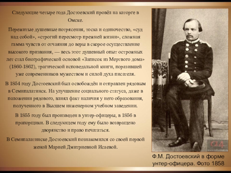 Слайд 7Ф.М. Достоевский в форме унтер-офицера. Фото 1858