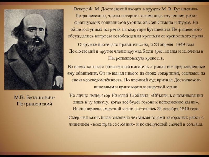 Вскоре Ф. М. Достоевский входит в кружок М. В. Буташевича-Петрашевского,