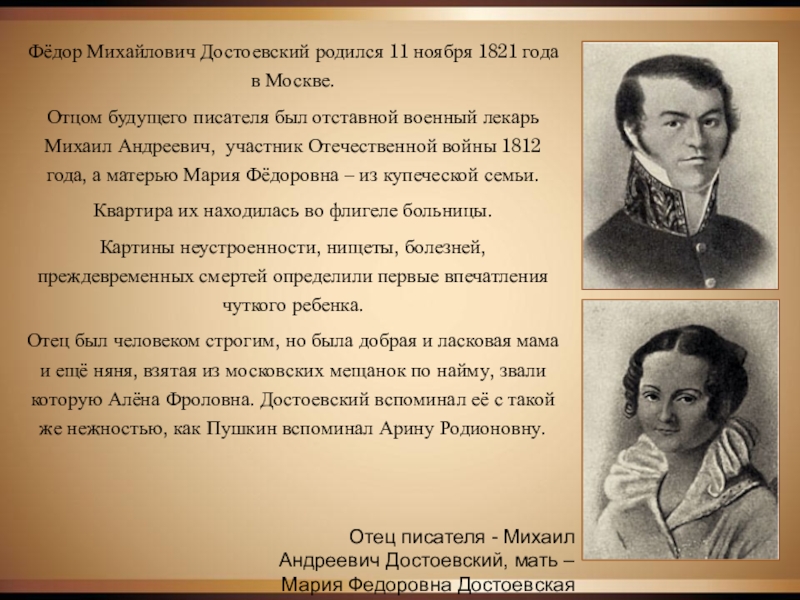 Отец писателя - Михаил Андреевич Достоевский, мать – Мария Федоровна Достоевская (Нечаева)