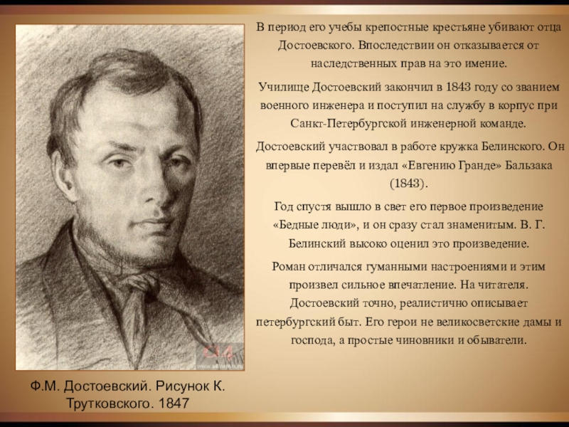 Слайд 5В период его учебы крепостные крестьяне убивают отца Достоевского. Впоследствии он