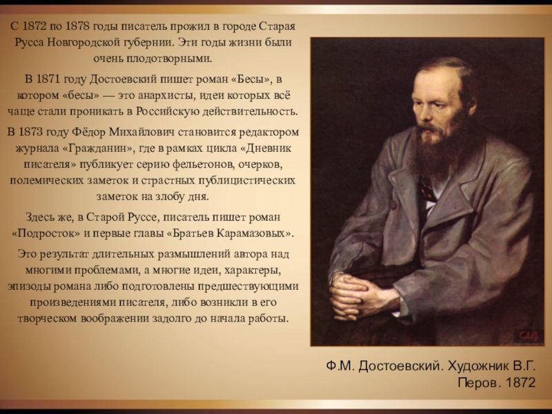 Слайд 13Ф.М. Достоевский. Художник В.Г. Перов. 1872
