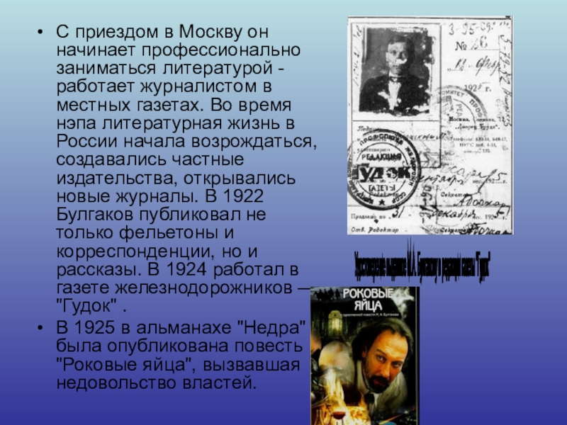 Удостоверение выданное М.А. Булгакову в редакции газеты "Гудок"