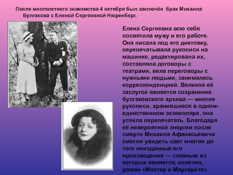 Елена Сергеевна всю себя посвятила мужу и его работе. Она писала под его диктовку, перепечатывала рукописи на машинке, редактировала их, составляла договоры с театрами, вела переговоры с нужными людьми, занималась корреспонденцией. Великой её заслугой является сохранение булгаковского архива — многие рукописи, хранившиеся в одном-единственном экземпляре, она успела перепечатать. Благодаря её невероятной энергии после смерти Михаила Афанасьевича смогли увидеть свет многие до того неизданные его произведения — главным из которых является, конечно, роман «Мастер и Маргарита».
