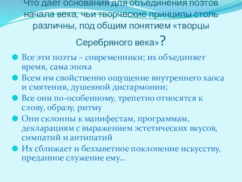 Они склонны к манифестам, программам, декларациям с выражением эстетических вкусов, симпатий и антипатий
