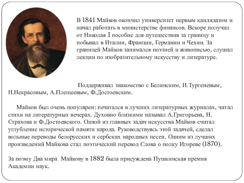В 1841 Майков окончил университет первым кандидатом и начал работать в министерстве финансов. Вскоре получил от Николая I пособие для путешествия за границу и побывал в Италии, Франции, Германии и Чехии. За границей Майков занимался поэзией и живописью, слушал лекции по изобразительному искусству и литературе.