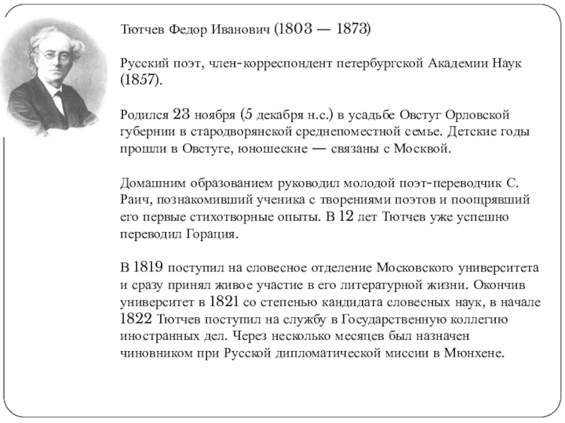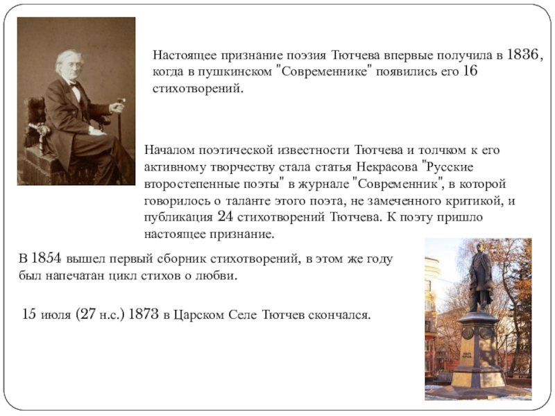 Началом поэтической известности Тютчева и толчком к его активному творчеству стала статья Некрасова "Русские второстепенные поэты" в журнале "Современник", в которой говорилось о таланте этого поэта, не замеченного критикой, и публикация 24 стихотворений Тютчева. К поэту пришло настоящее признание.