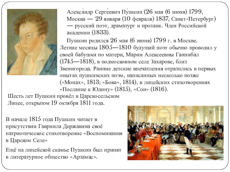 В начале 1815 года Пушкин читает в присутствии Гавриила Державина своё патриотическое стихотворение «Воспоминания в Царском Селе»