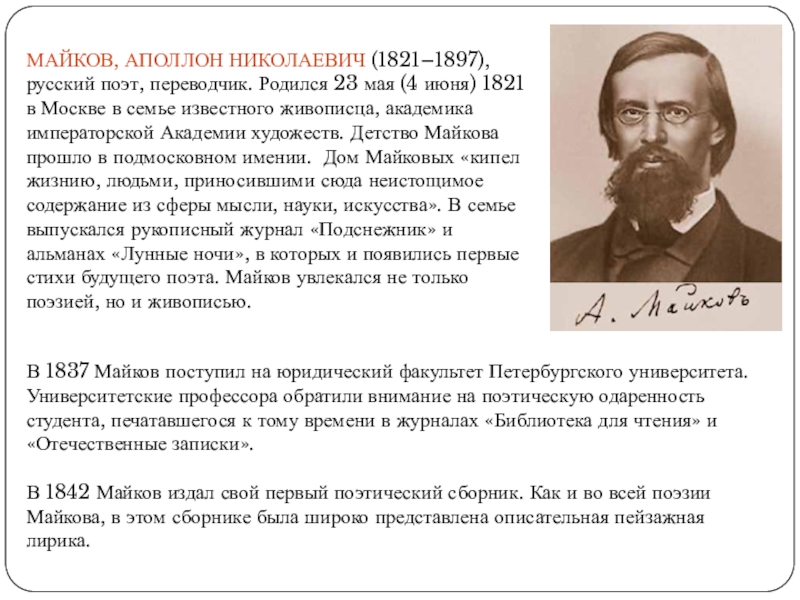 МАЙКОВ, АПОЛЛОН НИКОЛАЕВИЧ (1821–1897), русский поэт, переводчик. Родился 23 мая (4 июня) 1821 в Москве в семье известного живописца, академика императорской Академии художеств. Детство Майкова прошло в подмосковном имении. Дом Майковых «кипел жизнию, людьми, приносившими сюда неистощимое содержание из сферы мысли, науки, искусства». В семье выпускался рукописный журнал «Подснежник» и альманах «Лунные ночи», в которых и появились первые стихи будущего поэта. Майков увлекался не только поэзией, но и живописью.