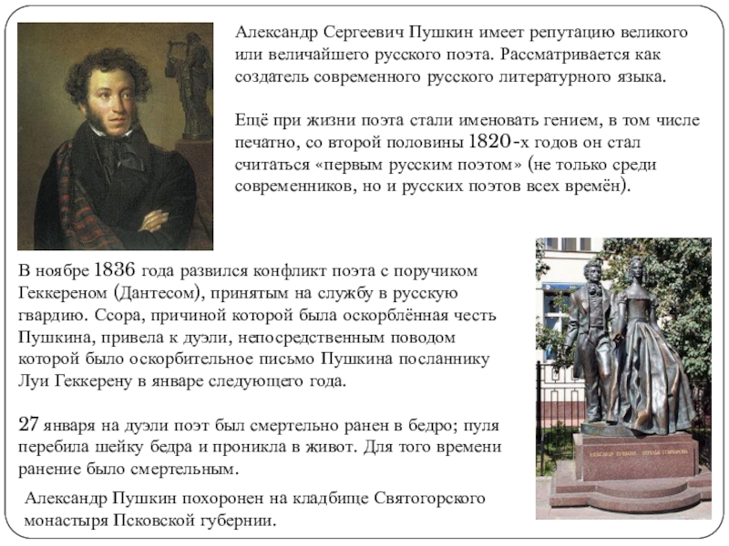 В ноябре 1836 года развился конфликт поэта с поручиком Геккереном (Дантесом), принятым на службу в русскую гвардию. Ссора, причиной которой была оскорблённая честь Пушкина, привела к дуэли, непосредственным поводом которой было оскорбительное письмо Пушкина посланнику Луи Геккерену в январе следующего года.