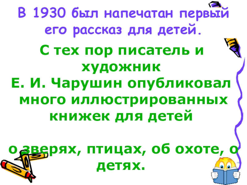 Слайд 15В 1930 был напечатан первый его рассказ для детей.
