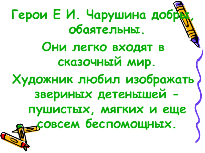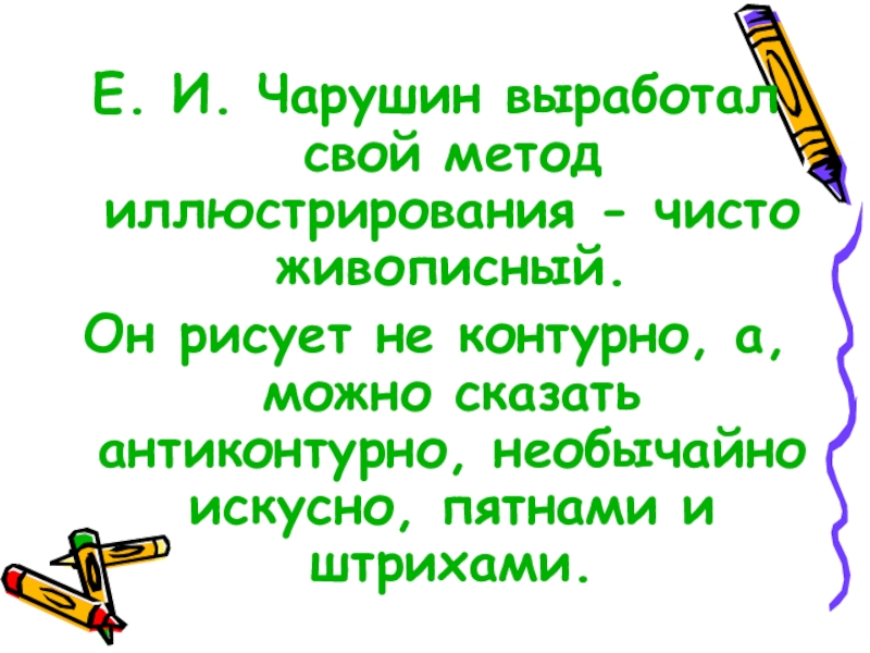 Е. И. Чарушин выработал свой метод иллюстрирования - чисто живописный.