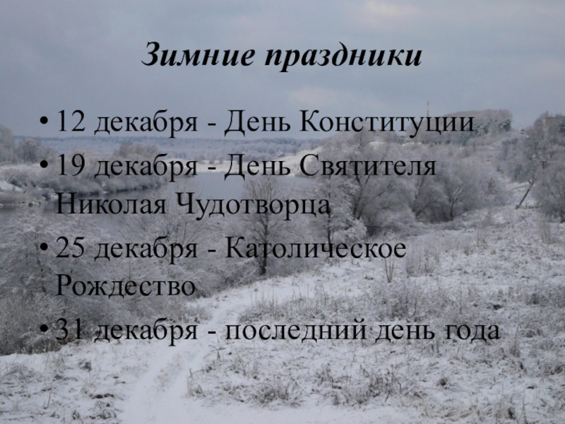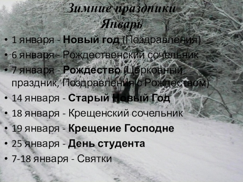 Более того, зима – это главные праздники, Новый год и Рождество! Взрослые и дети с нетерпением ждут этого дня. Люди наряжают Ёлку, зажигают огни, украшают дома, магазины, школы, парки. Самое приятное в новогодних праздниках – дарить и получать подарки.