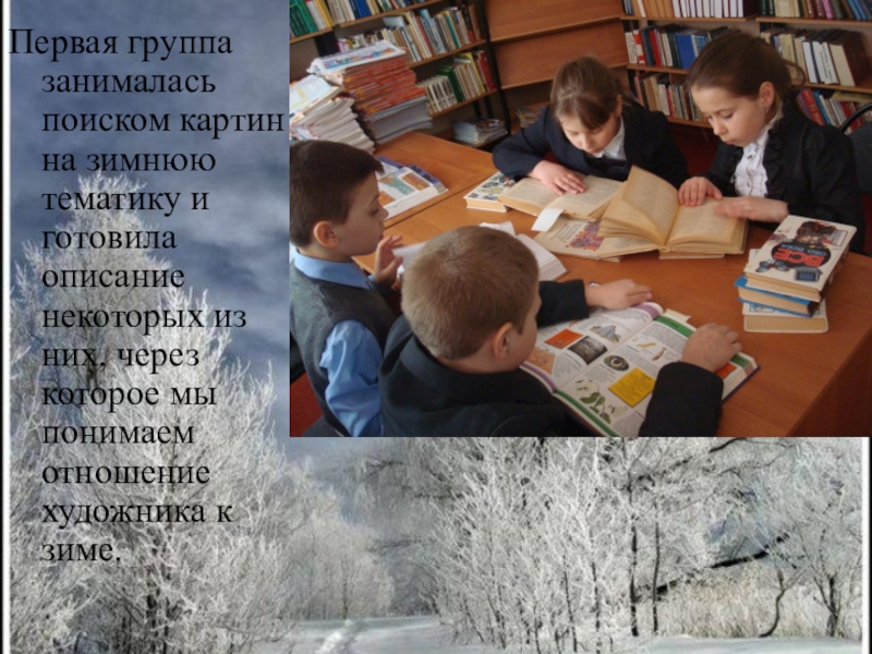 Слайд 8Первая группа занималась поиском картин на зимнюю тематику и готовила описание
