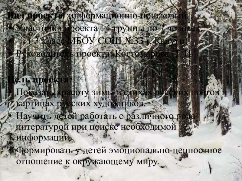 Показать красоту зимы в стихах русских поэтов и картинах русских художников.