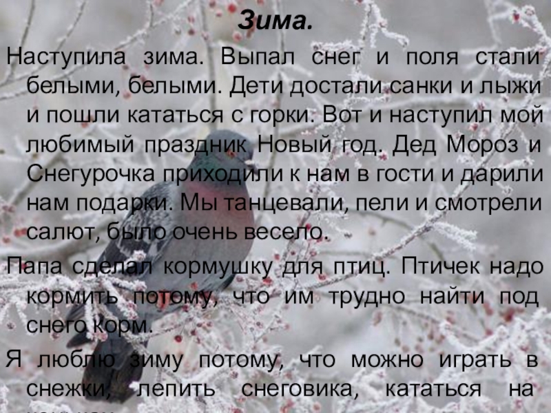 санки и лыжи и пошли кататься с горки. Вот и наступил мой любимый праздник Новый год. Дед Мороз и Снегурочка приходили к нам в гости и дарили нам подарки. Мы танцевали, пели и смотрели салют, было очень весело.