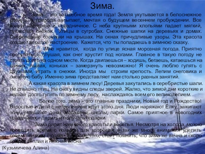 – это волшебное время года! Земля укутывается в белоснежное одеяло, а природа засыпает, мечтая о будущем весеннем пробуждении. Все вокруг нарядное и праздничное. С неба крупными хлопьями падает мягкий, пушистый снежок. Улицы в сугробах. Снежные шапки на деревьях и домах. Сверкающие сосульки на крышах. На окнах причудливые узоры. Эта красота создает веселое настроение. Кажется, что ты попадаешь в зимнюю сказку.