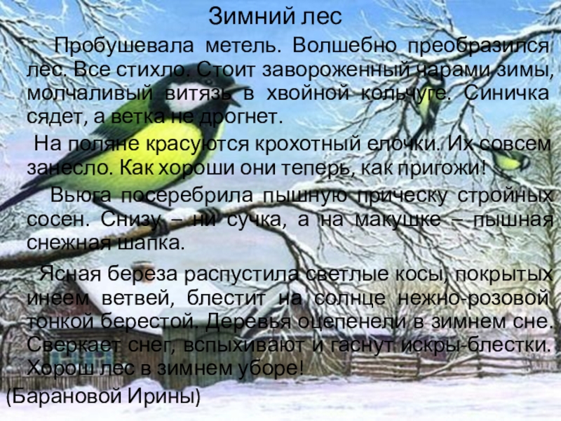 Ясная береза распустила светлые косы, покрытых инеем ветвей, блестит на солнце нежно-розовой тонкой берестой. Деревья оцепенели в зимнем сне. Сверкает снег, вспыхивают и гаснут искры-блестки. Хорош лес в зимнем уборе!