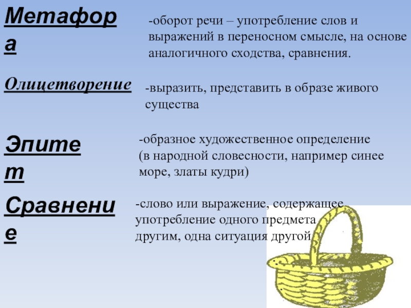 -слово или выражение, содержащее употребление одного предмета другим, одна ситуация другой