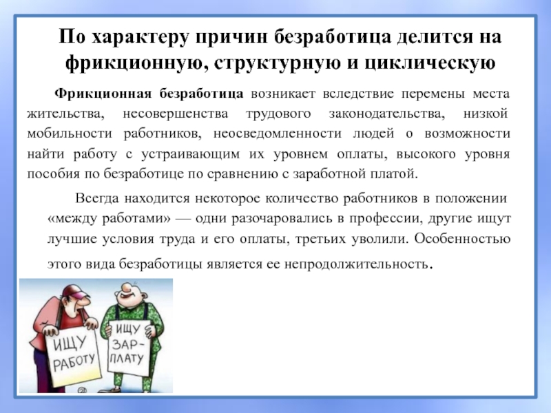 По характеру причин безработица делится на фрикционную, структурную и циклическую