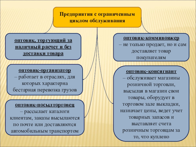 предоставляют такие услуги, как хранение товарных запасов, рекомендации продавцов, кредитование, обеспечение доставки товара и оказание содействия в управлении