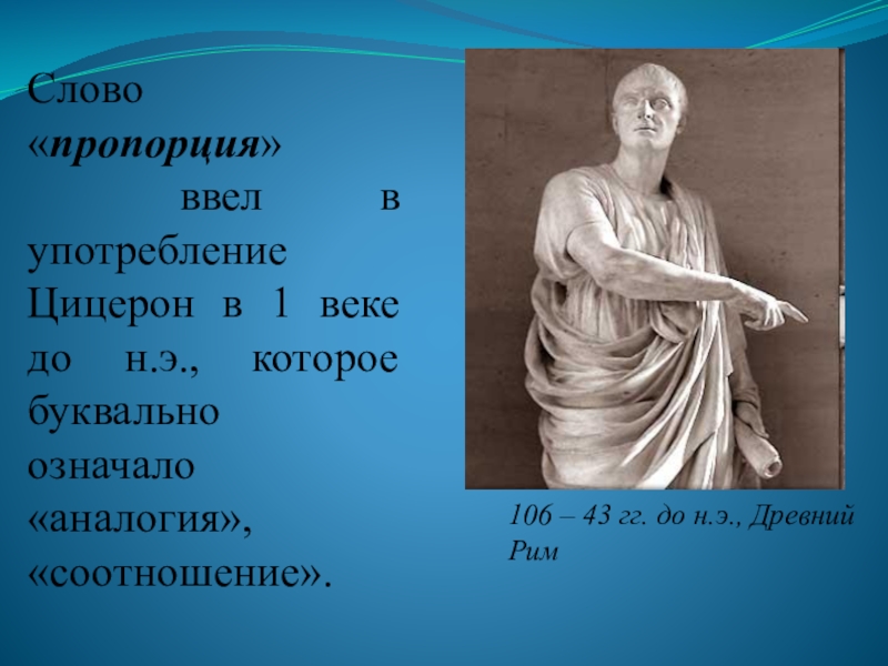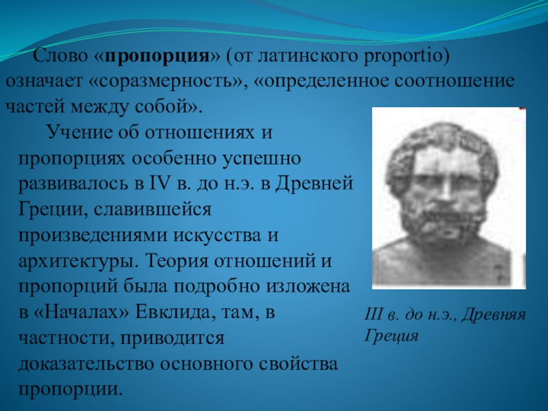 Слово «пропорция» (от латинского proportio) означает «соразмерность», «определенное соотношение частей между собой».
