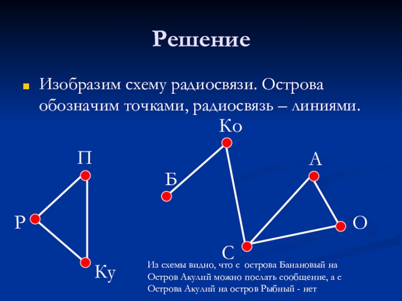Изобразим схему радиосвязи. Острова обозначим точками, радиосвязь – линиями.