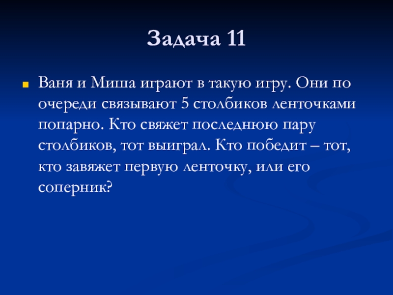 связывают 5 столбиков ленточками попарно. Кто свяжет последнюю пару столбиков, тот выиграл. Кто победит – тот, кто завяжет первую ленточку, или его соперник?