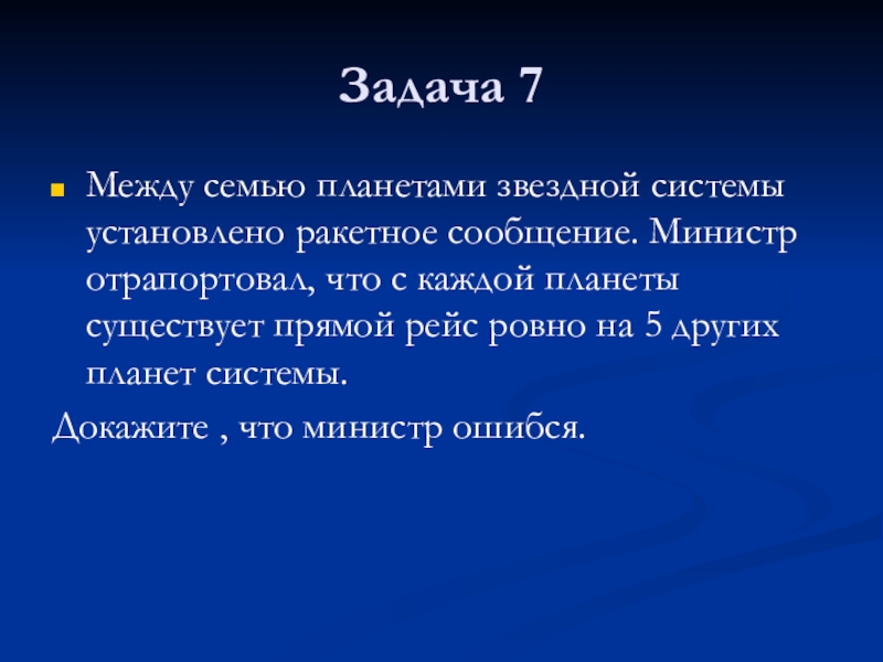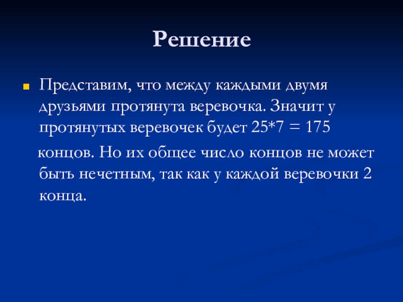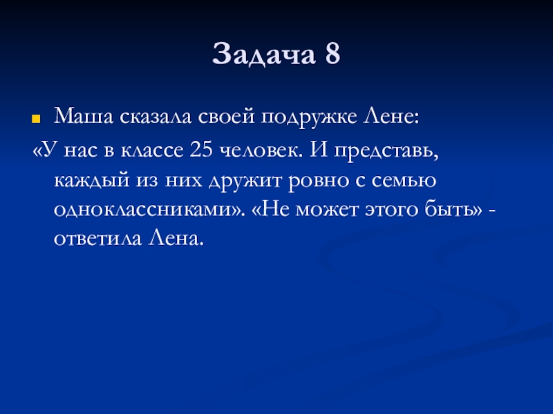 И представь, каждый из них дружит ровно с семью одноклассниками». «Не может этого быть» - ответила Лена.