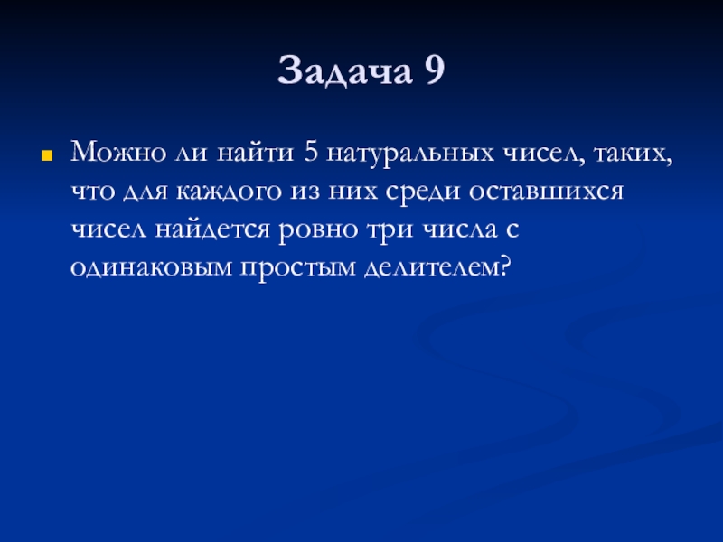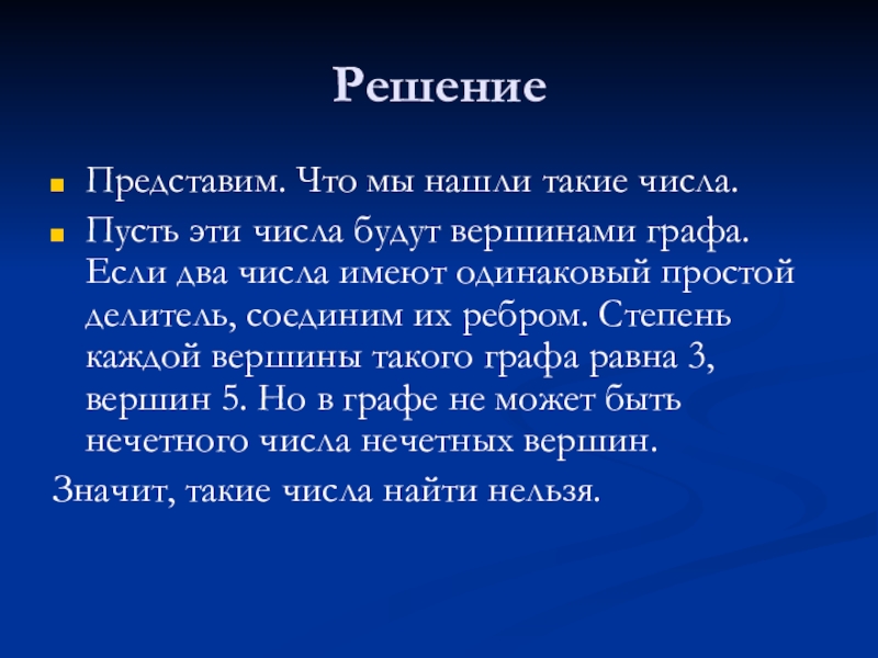 графа. Если два числа имеют одинаковый простой делитель, соединим их ребром. Степень каждой вершины такого графа равна 3, вершин 5. Но в графе не может быть нечетного числа нечетных вершин.