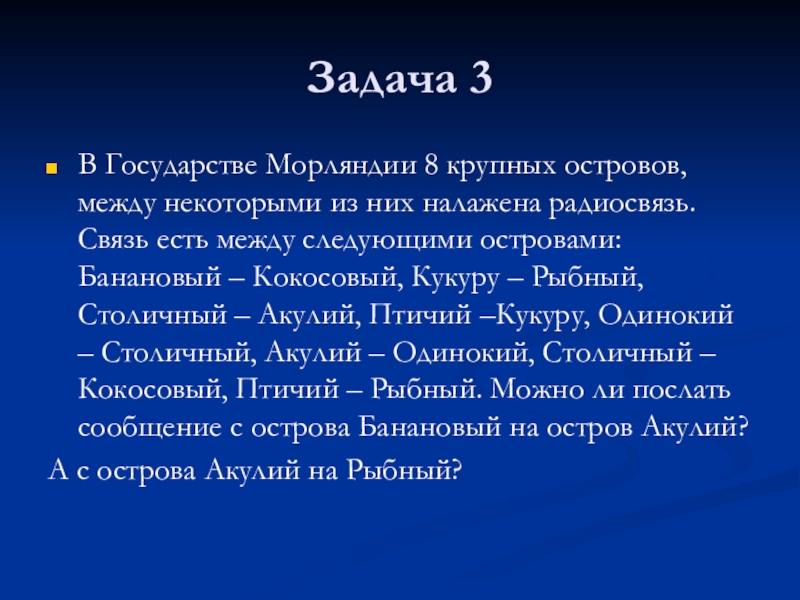 налажена радиосвязь. Связь есть между следующими островами: Банановый – Кокосовый, Кукуру – Рыбный, Столичный – Акулий, Птичий –Кукуру, Одинокий – Столичный, Акулий – Одинокий, Столичный – Кокосовый, Птичий – Рыбный. Можно ли послать сообщение с острова Банановый на остров Акулий?