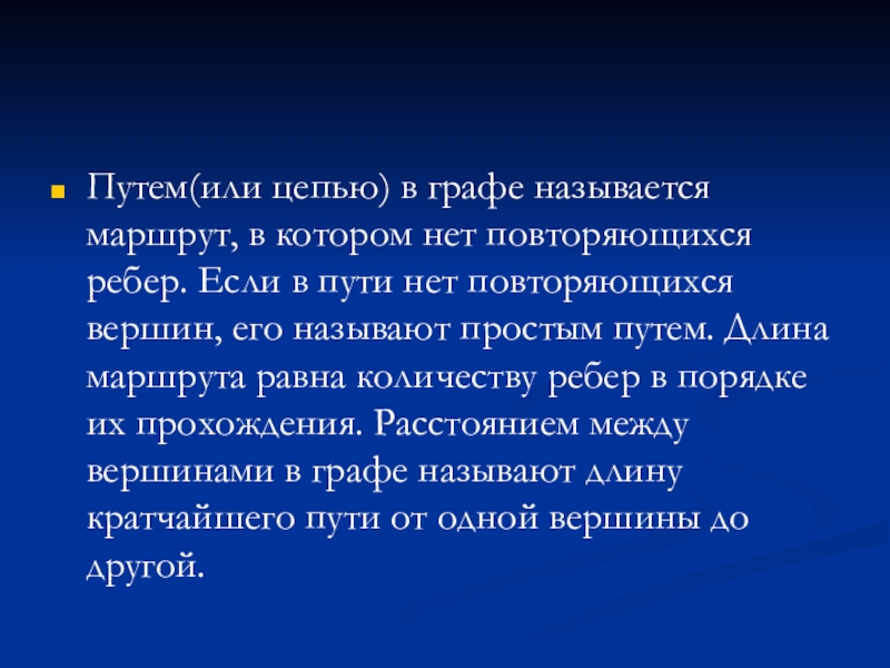 Слайд 41Путем(или цепью) в графе называется маршрут, в котором нет повторяющихся ребер.