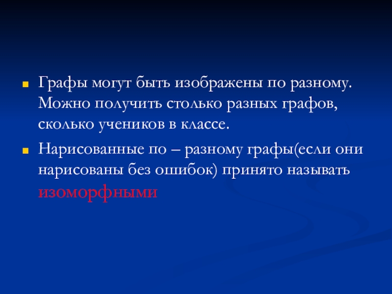 Нарисованные по – разному графы(если они нарисованы без ошибок) принято называть изоморфными