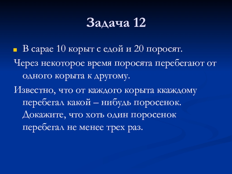 Известно, что от каждого корыта ккаждому перебегал какой – нибудь поросенок. Докажите, что хоть один поросенок перебегал не менее трех раз.