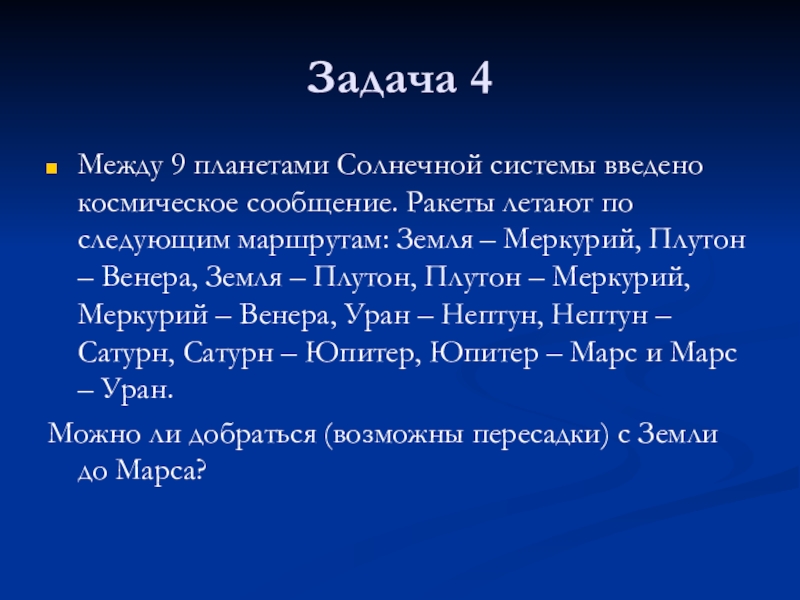 по следующим маршрутам: Земля – Меркурий, Плутон – Венера, Земля – Плутон, Плутон – Меркурий, Меркурий – Венера, Уран – Нептун, Нептун – Сатурн, Сатурн – Юпитер, Юпитер – Марс и Марс – Уран.