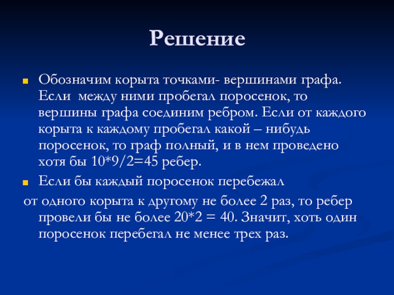 вершины графа соединим ребром. Если от каждого корыта к каждому пробегал какой – нибудь поросенок, то граф полный, и в нем проведено хотя бы 10*9/2=45 ребер.