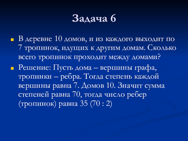 Решение: Пусть дома – вершины графа, тропинки – ребра. Тогда степень каждой вершины равна 7. Домов 10. Значит сумма степеней равна 70, тогда число ребер (тропинок) равна 35 (70 : 2)