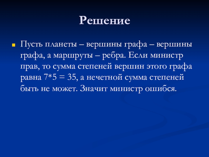 ребра. Если министр прав, то сумма степеней вершин этого графа равна 7*5 = 35, а нечетной сумма степеней быть не может. Значит министр ошибся.