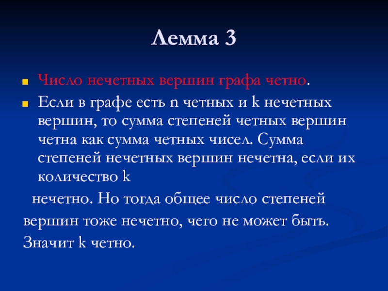 и k нечетных вершин, то сумма степеней четных вершин четна как сумма четных чисел. Сумма степеней нечетных вершин нечетна, если их количество k